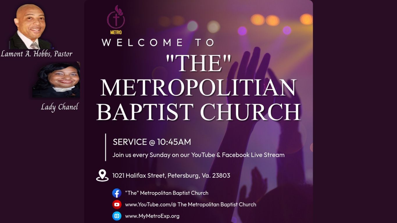 We are the Metropolitan Baptist Church. We strive to make a difference in the world by ministering to the spiritual, emotional, and physical needs of those inside and outside the church. We always seek to empower people by helping them to utilize, maximize, and capitalize on their God given gifts and talents. We will create learning environments that embrace teaching, loves knowledge, and is always in the pursuit of wisdom. Our worship experiences will be purposeful and powerful and we will always conduct ourselves with order, excellence and the highest level of ethics, integrity, and conduct that is representative of the God we serve.
